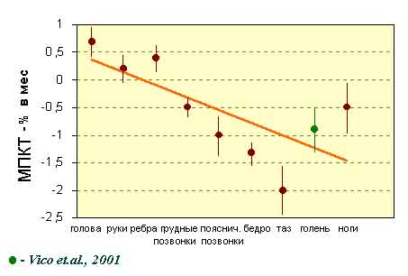 [Оганов и др., 1997а] (ссылка по книге №98 с полным составом авторов). Гипотеза хорошо подтверждается нашими (совместно со специалистами США) данными исследований после космических полетов (4-6 месяцев), которые свидетельствуют о полуторократном возрастании активности резорбции по сравнению с предполетным уровнем (N-телопептиды, пиридинолин деоксипиридинолин). И лишь через 2-3 недели отмечали признаки активации костеобразования в виде статистически достоверного повышения содержания специфической костной щелочной фосфатазы и остеокальцина [Smith et al., 2004]. 3.3.6. О возможных механизмах остеопении в космическом полете. Системный
