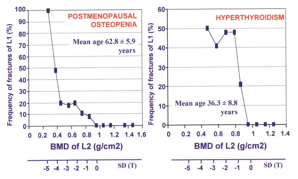 При изучении частоты переломов у женщин, больных тиреотоксикозом учитывали, что нарушения функции щитовидной железы всегда изменяют метаболизм кости. Тиреоидные гормоны увеличивают остеокластическую резорбцию и при повышении активности вызывают мобилизацию Са2+ из костной ткани и развитие остеопороза. Очень часто у больных тиреотоксикозом при проведении денситометрических исследований обнаруживается ОП, даже если биохимические и рентгенографические признаки заболевания скелета отсутствуют [Passariello et al., 1997]. Потери костной массы при тиреотоксикозе развиваются быстро, и, как было показано, скорость снижения МПКТ поясничных позвонков составляет 9% в год при ятрогенном гипертиреоидизме, вызванном назначением L-thyroxin при гипотиреозе [Krolner et al., 1983]. Развитие ОП происходит и в трабекулярной, и в кортикальной костной ткани. В выборку были включены больные с тяжелыми симптомами заболевания, находившиеся в клиниках Российской медицинской академии последипломного образования МЗ РФ (Москва) и Государственного научного эндокринологического центра РАМН (Москва). В выборку включены только женщины - всего 227 человек, в том числе с компрессионными переломами позвонков - 82 человека. Средний возраст больных составлял 36,3 ± 8,8 года. Данные о частоте переломов суммированы на рис. 14. При снижении минеральной плотности L2 до 0,8 г/см2 и ниже частота встречаемости переломов L1 резко возрастала, что существенно отличалось от распределения при постменопаузальном и сенильном ОП. Хорошо видно увеличение риска перелома почти в 2-2,5 раза по сравнению с постменопаузальным ОП при одинаковом уровне снижения МПКТ. Анализ литературы и результаты собственных исследований подтверждают многочисленные данные о том, что в статистическом плане механические свойства костей зависимы от костной массы, поэтому на основе данных остеоденситометрии возможно лишь вероятностное прогнозирование риска перелома. При этом, как показано нашими исследованиями, вероятность прогноза будет существенно зависеть от формы ОП: инволюционного (1-го и 2-го типов) и различных форм вторичного ОП. В последнем случае, как показано выше, существенное значение имеет скорость развития болезни (например, тиреотоксикоз) либо, напротив, какие-то защитные реакции, снижающие вероятность перелома при наличии явного фактора риска в виде дефицита питания (нервная анорексия) [Чернихова и др., 2003]. Индивидуальный прогноз осложняется высокой вариабельностью изменений, формирующих "качество" кости, что, в свою очередь, существенным образом не только зависит от нозологии, но и определяется генетическими факторами.