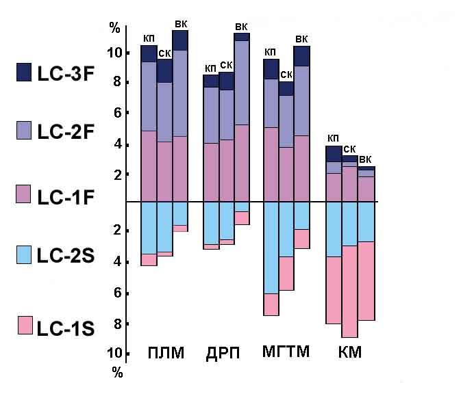 наименьшая - в ДРП и ПЛМ (10 и 16% - различия недостоверны). Статистически