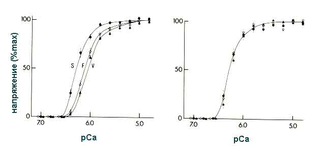 В норме КМ содержит лишь следы данной изоформы миозина. Как известно, ЛЦ-3 входит в структуру молекулы лишь двух изоформ "быстрого" миозина, и с ней ассоциируется высокая АТФазная активность быстрых мышечных волокон [Weeds, Taylor, 1975; Taylor et al., 1977]. Одновременно в быстрых мышцах (ПЛМ, ДРП, МГТМ) отмечена перестройка состава популяций миозинов с увеличением изоформ "медленных" миозинов, хотя только в ПЛМ это сопровождалось отчетливым снижением скорости сокращения мышечных волокон [Оганов и др., 1982] и снижением чувствительности к Са в быстрой икроножной мышце [Holy et al., 1985] (Рис.3).