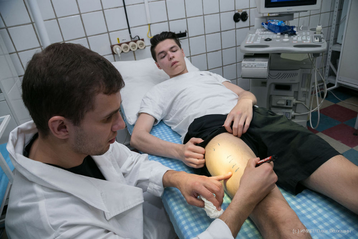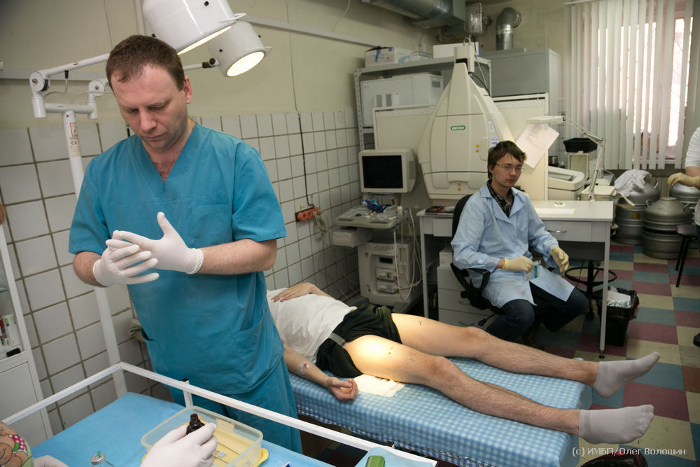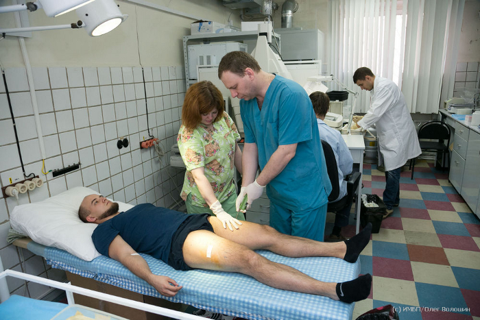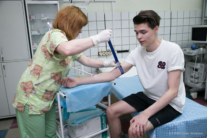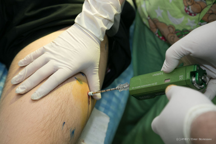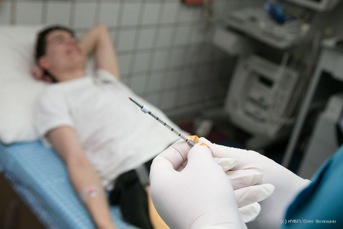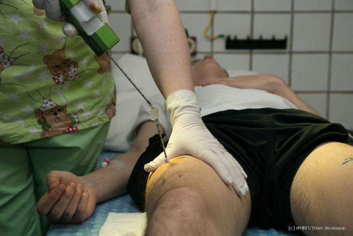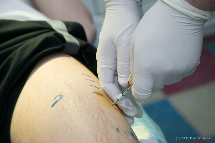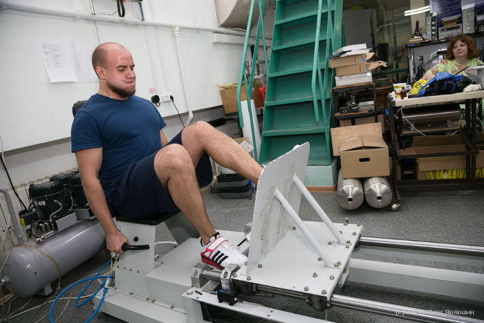 В экспериментальный день спортсмены выполняют жим платформы одной ногой на специализированном тренажере с пневматическим приводом. До и после тренировки берутся пробы венозной крови для определения уровня гормонов в крови, а также пробы мышечной ткани для анализа ростовых процессов, активируемых в ответ на нагрузку.