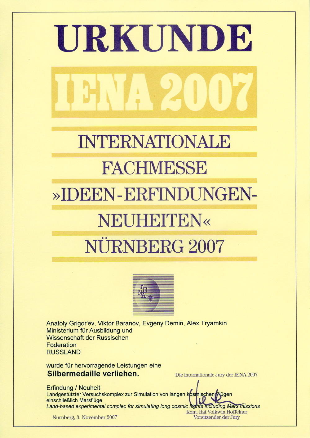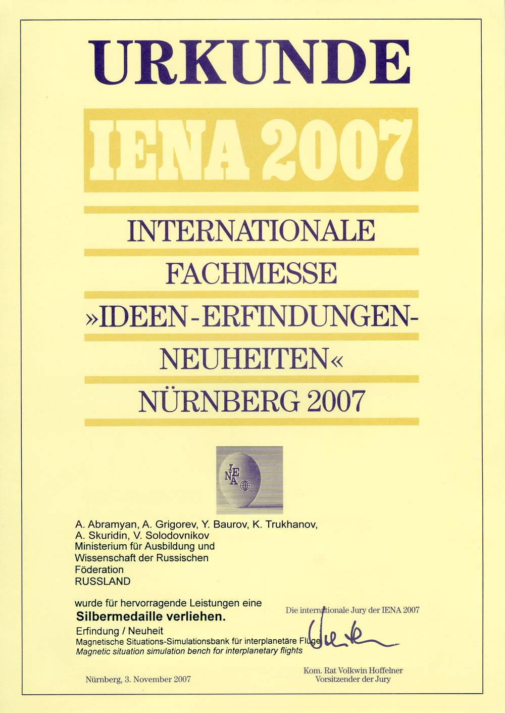 С 1 по 4 ноября 2007 года Институт принимал участие в 59-й Международной выставке "Идеи - изобретения - инновации" ("IENA-2007"), проводившейся в г. Нюрнберге, Германия.