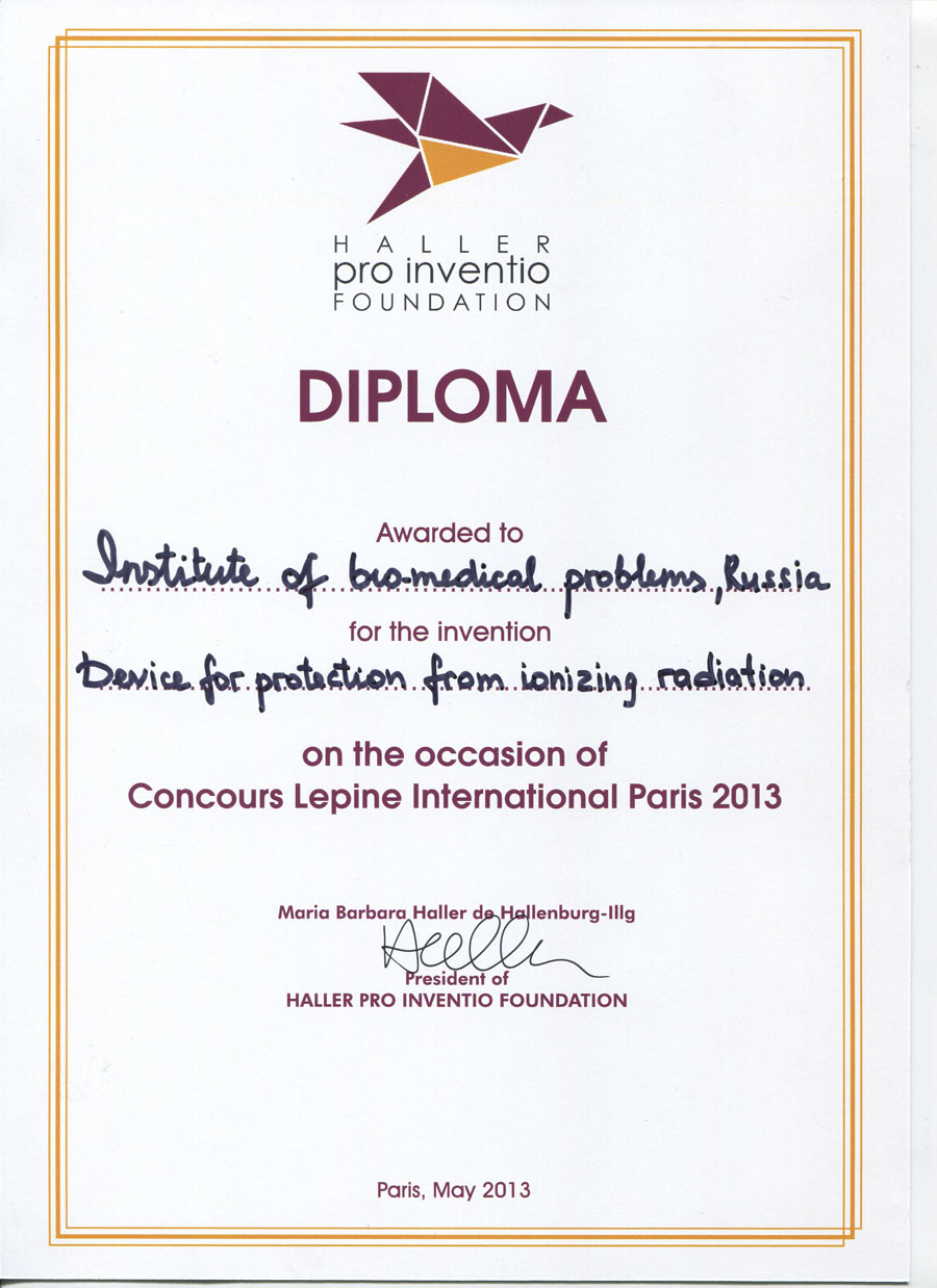 - Устройство для защиты от ионизирующего излучения в помещениях космического корабля (авторы: Ушаков И.Б., Шуршаков В.А., Ярманова Е.Н. и др.) – Серебряная медаль, Диплом