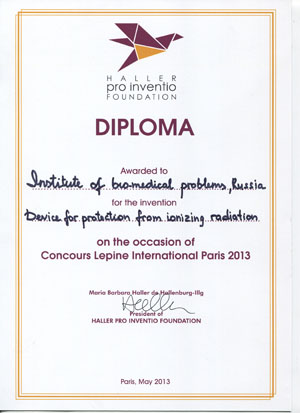 Также разработка «Устройство для защиты от ионизирующего излучения в помещениях космического корабля» получила специальный приз и Диплом к нему.