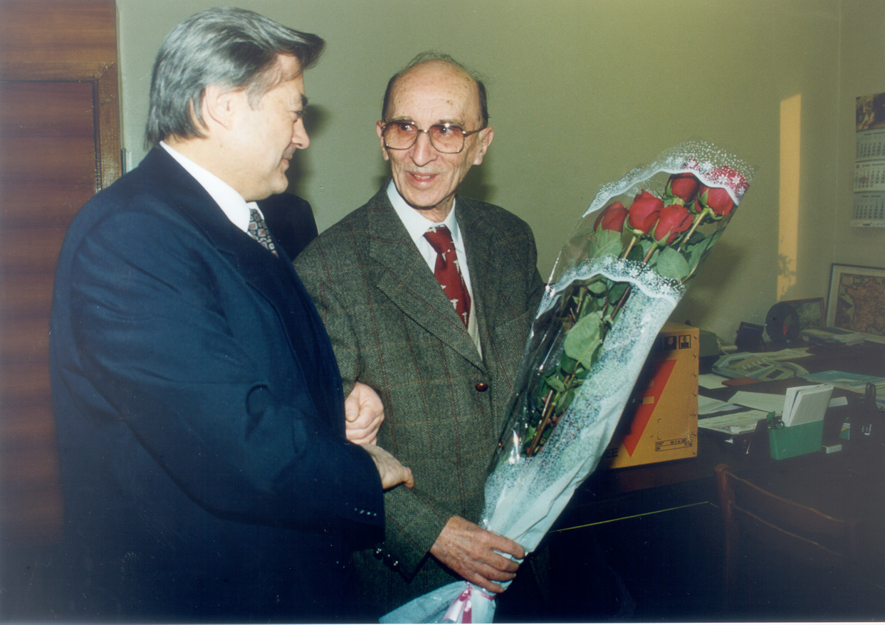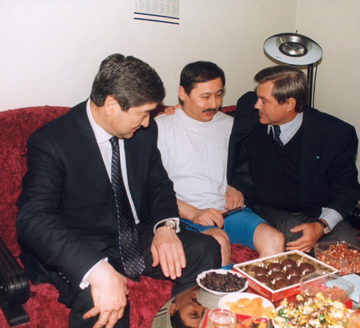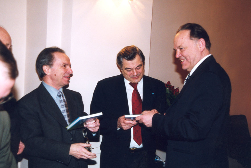 Awarding of A.I. Grigoriev with Bauer Prize, Cincinnati, the USA, 2001. A.I. Grigoriev congratulates academician O.G. Gazenko with his jubilee, 1998. A.I. Grigoriev and cosmonaut T. Musabaev in the "Cosmonavt" hotel at Baikonur after successful landing. 1998