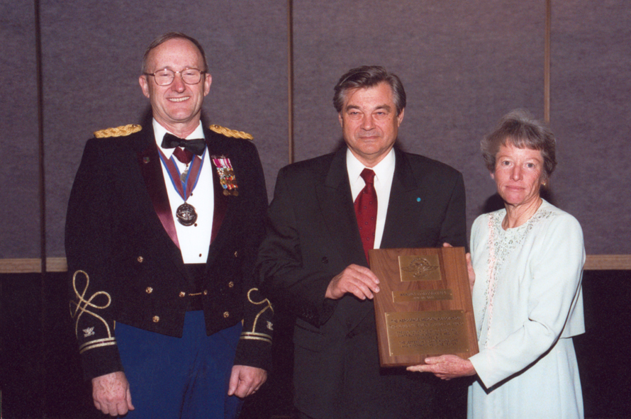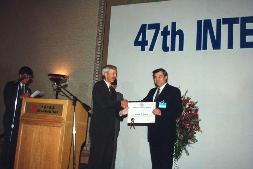 Mr. K. Deutch is rewarding the IAF Vice-president A.I. Grigoriev with the highest award of the Federation named after Allan D. Emil, Peking, China, 1996.