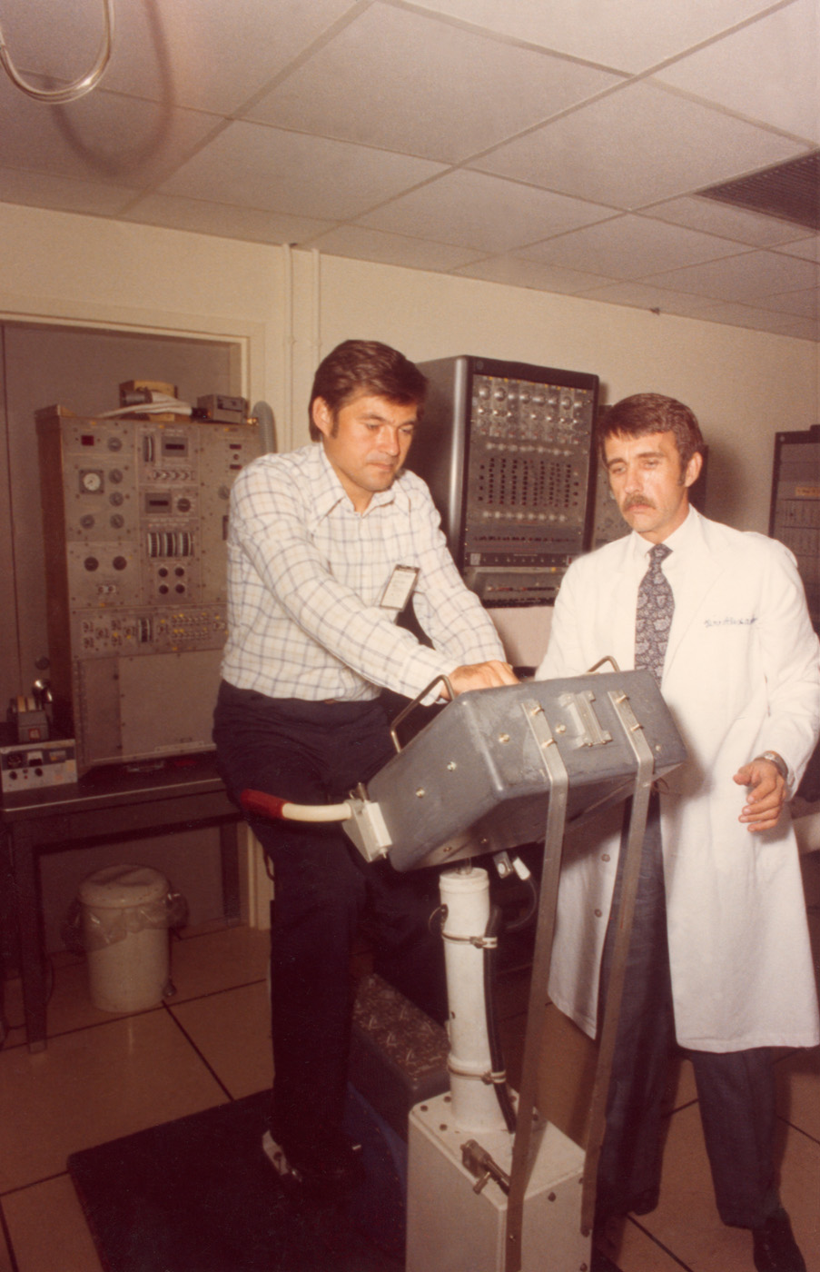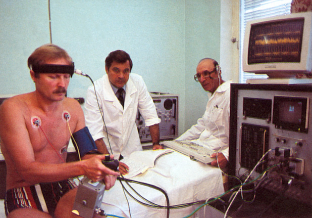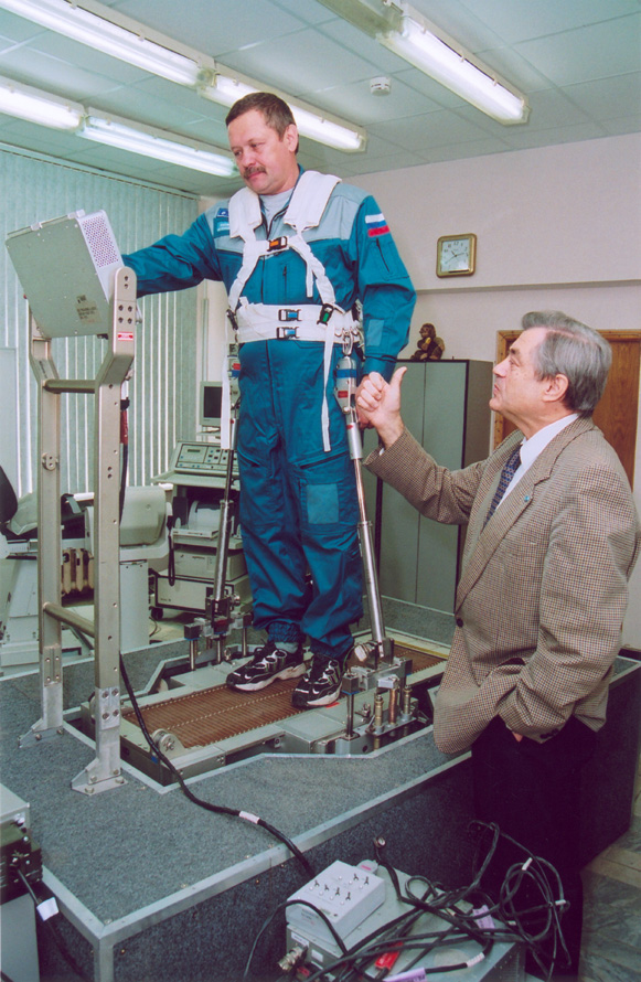 A.I. Grigoriev and physician-cosmonaut B.V. Morukov during testing on the treadmill for the International Space Station, 2002.