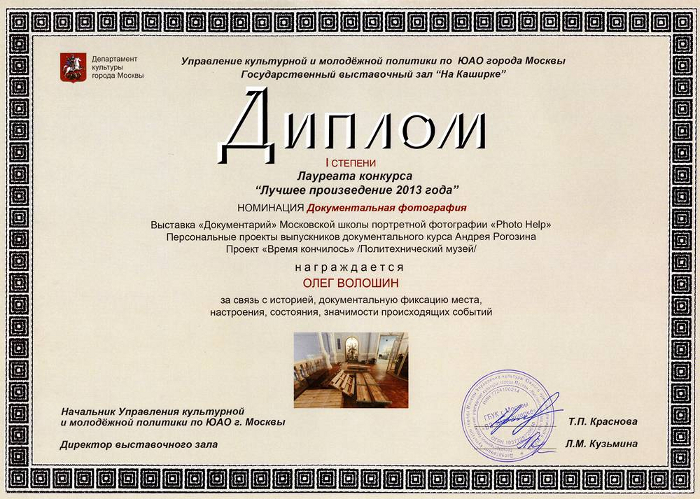 27 февраля в Государственном выставочном зале «На Каширке» состоялось вручение дипломов лауреатам конкурса "Лучшие произведения года 2013" по версии Государственного выставочного зала "На Каширке". В номинации «Документальная фотография» диплом первой степени получил сотрудник нашего института Олег Волошин.
